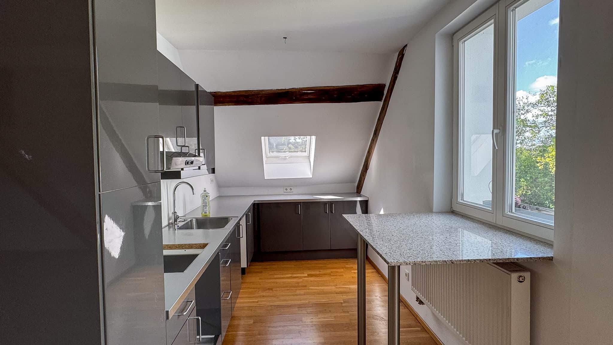 ist unsere Dachgeschoßwohnung mit großer Terrasse und schönem Blick in den Innenhof und auf den Dingelberg.