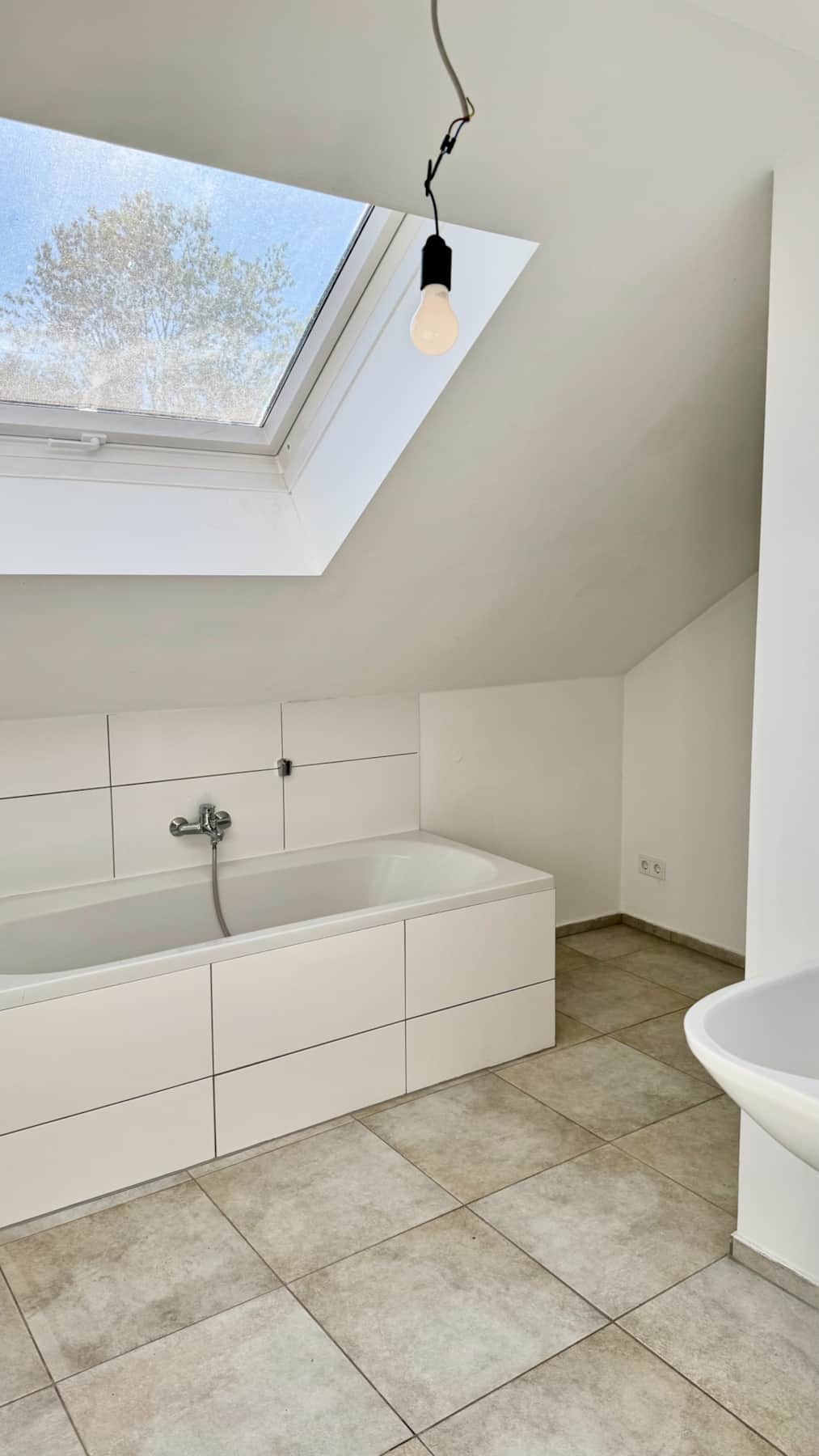 Die Wohnung verfügt über ein Bad mit Fußbodenheizung, mit stufenloser Dusche in einer Mauernische. Badewanne und Dachflächenfenster sind
